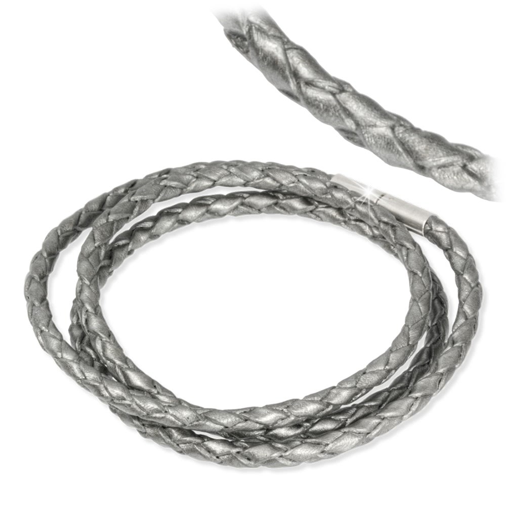 Ein dreifach gewickeltes Leder Armband geflochten in der Farbe silber mit Sterling Silber 925er Bajonett Verschluss. Die Breite des Bandes ist 3mm und die Länge bei dreifacher Wicklung ist 17cm. Das Lederarmband hat eine Gesamtlänge von 51cm. Dieses Lederband eignet sich auch hervorragend zum tragen als Kette!