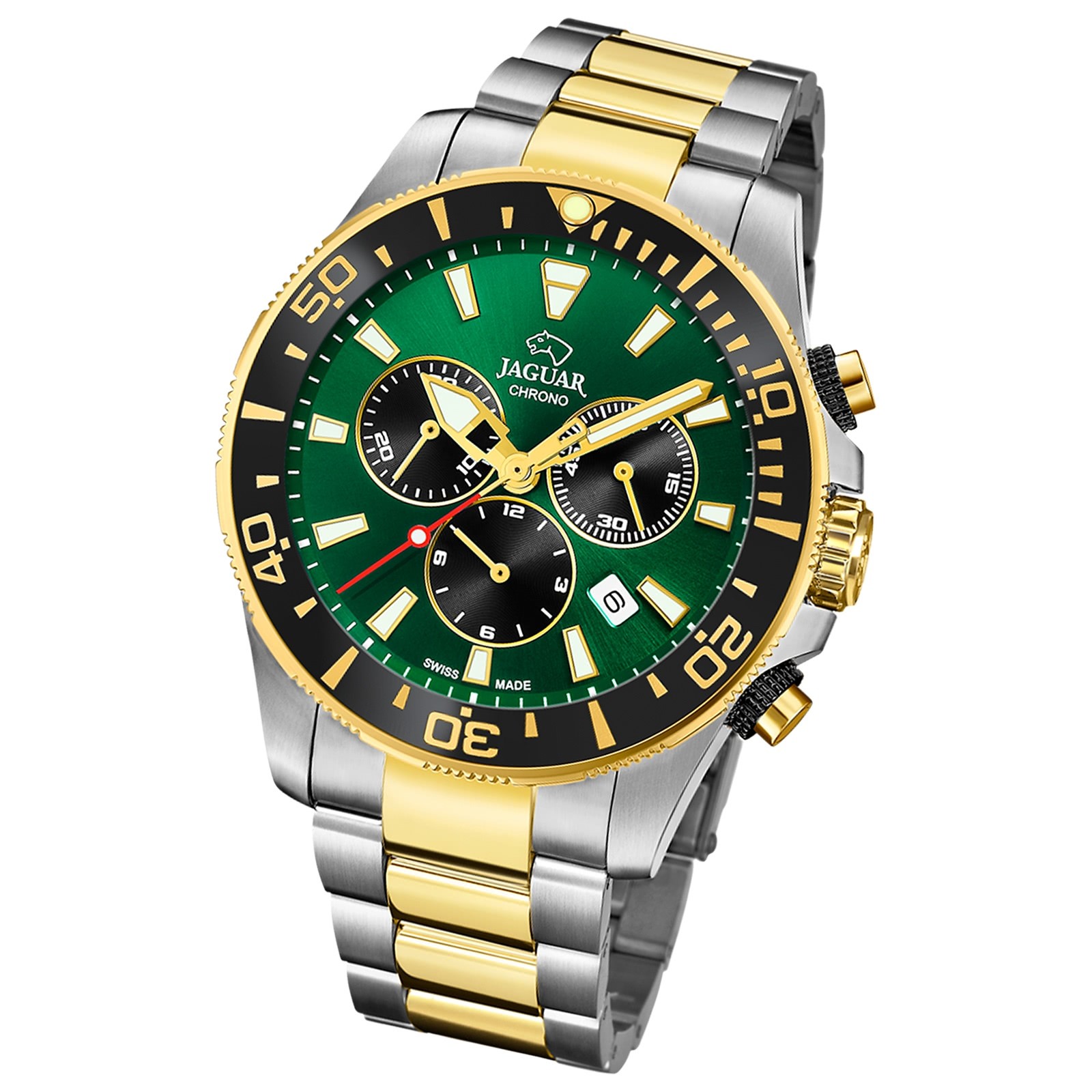 Der Hersteller Jaguar bietet eine erstklassige Herrenuhr aus wertigem Edelstahl mit gold/silbernem Armband an. Das Uhrengehäuse ist aus beständigem Edelstahl gefertigt. Ein wertiges Saphirglas bewahrt die Uhr vor äußeren Einflüssen.- Zusatzinformation
