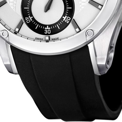 Die Quarzuhr von Jaguar hat ein silbernes Gehäuse aus Edelstahl mit silber/schwarzem Ziffernblatt. Das Kunststoffarmband ist außerdem schwarz. An Ihrem Handgelenk wird das Uhrenarmband mit einer Faltschließe fest geschlossen.- Zusatzinformation