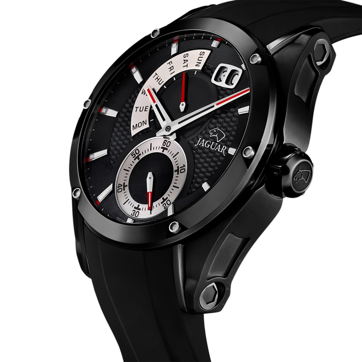 Diese Fashion Uhr für Herren, ausgestattet mit einem hochwertigen schwarzen PU-Armband, kommt aus der exklusiven Jaguar Kollektion Special Edition. Die Analoguhr zeichnet sich vor Allem durch ein höchst präzises Quarzwerk aus und ist bis 10 bar wasserdicht.- besondere Eigenschaften