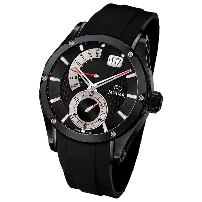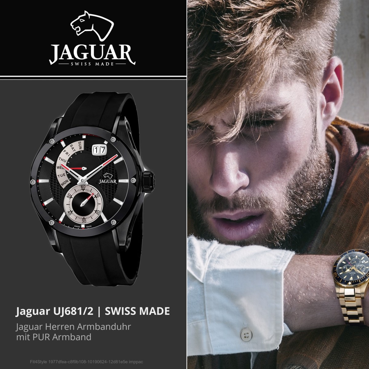 J681/2 eine Uhr für Herren der Marke Jaguar mit schwarzem Armband aus Kunststoff und silber/schwarzem Zifferblatt. Die Uhr hat eine Wasserdichtigkeit bis 10 bar und ist deshalb zum Duschen, Baden und Schwimmen optimal geeignet.- Zusatzinformation
