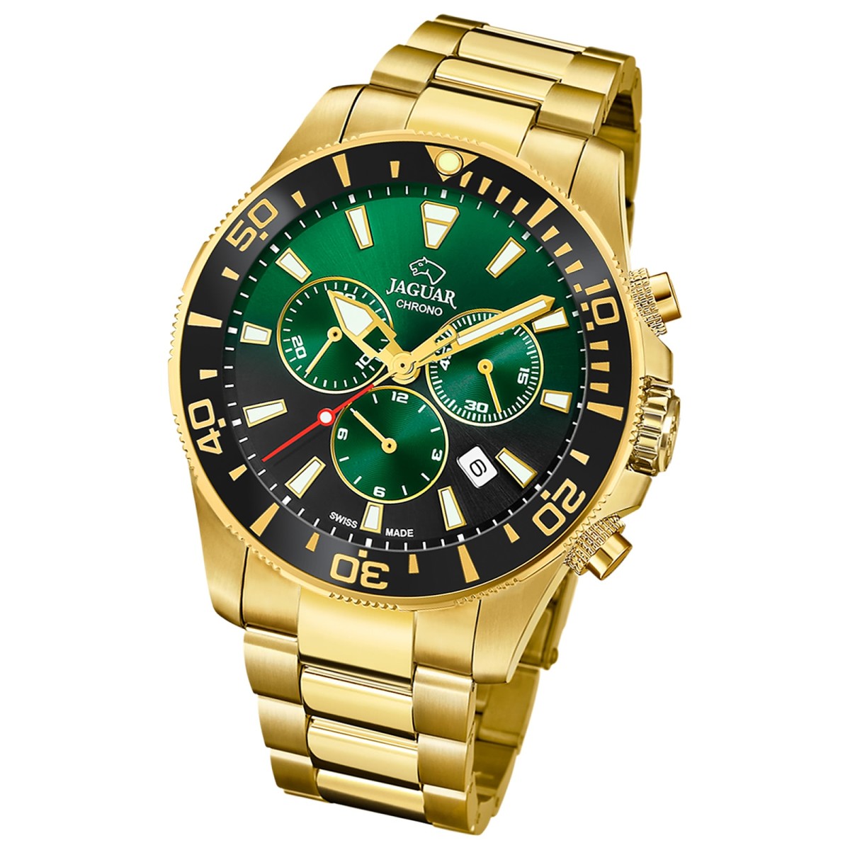 Herrenuhr der Schweizer Marke JAGUAR aus der EXECUTIVE PIONNIER Kollektion. Das Modell in schwarz und grün Farbe, mit schwarzem und grünem Zifferblatt und goldenen Zeigern, bietet perfekte Ablesbarkeit dank seines Saphirglases.- Zusatzinformation