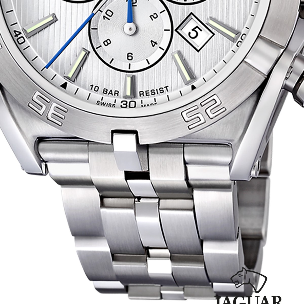 Diese einzigartige Uhr für Herren aus der aktuellen Jaguar Executive Kollektion garantiert hohen Tragekomfort durch das hochwertige Edelstahl-Armband in silber. Der Chronograph und präzisem Armbanduhr ist ein zuverlässiger Begleiter in Alltag und Freizeit.- besondere Eigenschaften