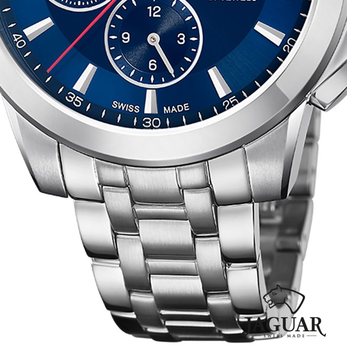 Diese einzigartige Uhr für Herren aus der aktuellen Jaguar Le Chronographe Kollektion garantiert hohen Tragekomfort durch das hochwertige Edelstahl-Armband in silber. Der Chronograph und präzisem Armbanduhr ist ein zuverlässiger Begleiter in Alltag und Freizeit.- besondere Eigenschaften