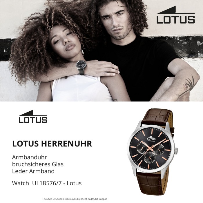 Lotus Uhren haben trendige, kompromisslos ausgesuchte Qualität und sind trotzdem zu einem erschwinglichen Preis erhältlich. Die Lotus Uhren Kollektionen sind eine Mischung aus hochwertig, sportlich und glamourös verarbeiteten Uhren. Sie sind damit die perfekten und geschmackvollen Begleiter für das tägliche oder extravagante Outfit.