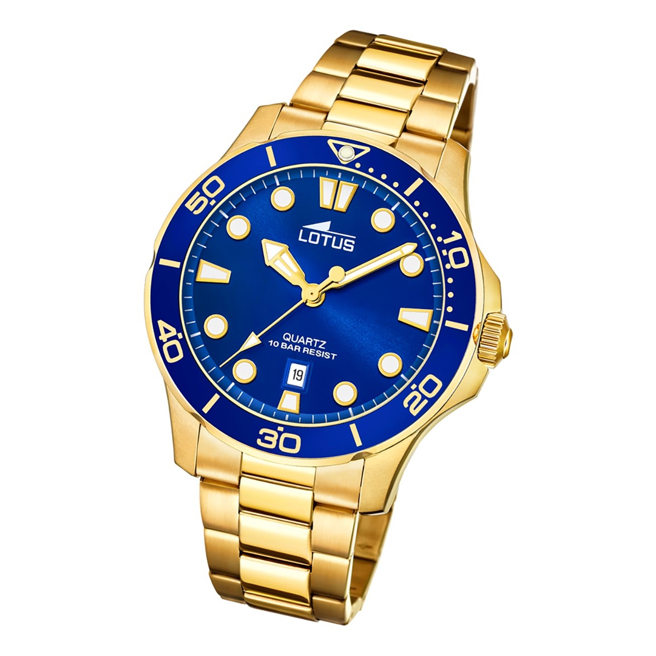 Diese Fashion Uhr für Herren aus der exklusiven Lotus Sport-Kollektion verfügt über ein hochwertiges Edelstahl-Armband in gold. Das analoge Quarzwerk und die Wasserdichte bis 10 bar machen diese Armbanduhr zu einem besonders zuverlässigen Begleiter.- Besonderheiten: