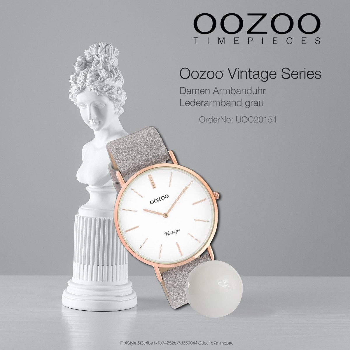 Diese Fashion Uhr für Damen aus der exklusiven Oozoo Vintage Series-Kollektion verfügt über ein hochwertiges Leder-Armband in grau. Das analoge Uhrwerk und eine Wasserdichtigkeit bis 3 bar machen diese Armbanduhr zu einem besonders zuverlässigen Begleiter.- besondere Eigenschaften