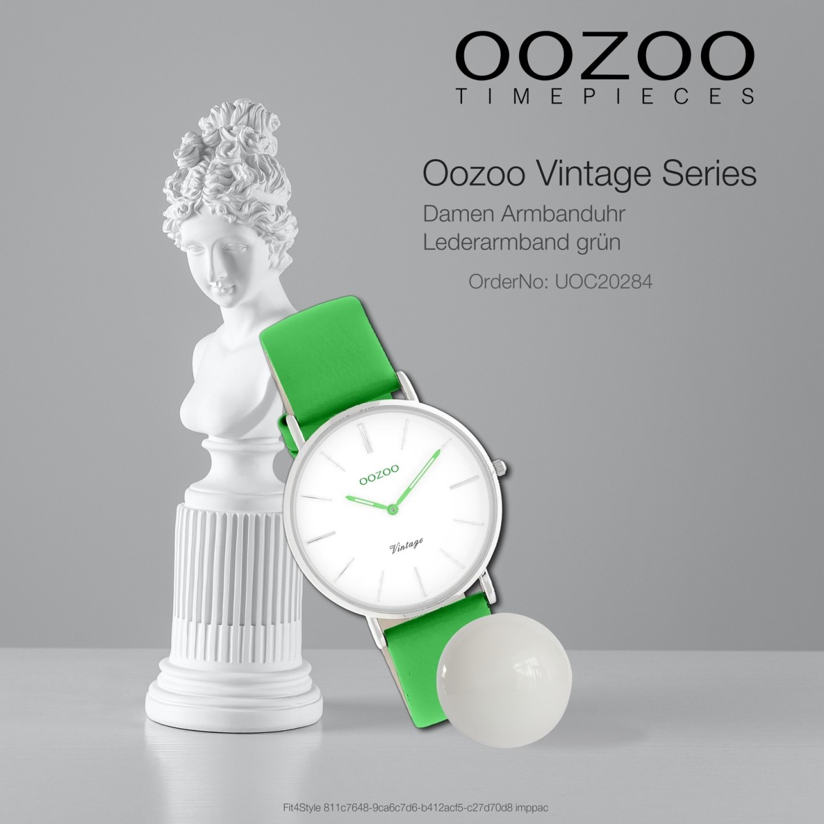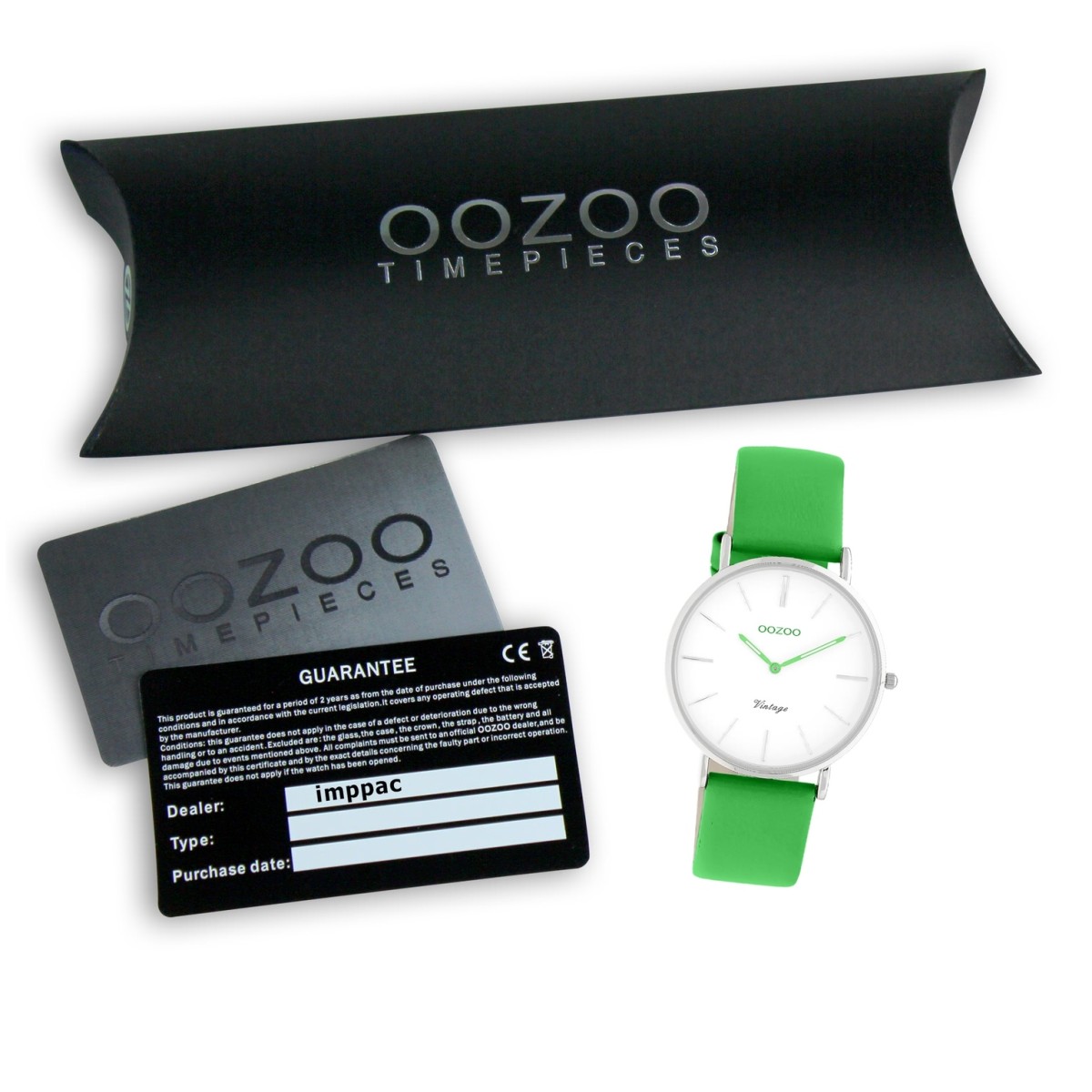 Diese Fashion Uhr für Damen aus der exklusiven Oozoo Oozoo Vintage Series-Kollektion verfügt über ein hochwertiges Leder-Armband in grün. Das analoge Uhrwerk und eine Wasserdichtigkeit bis 3 bar machen diese Armbanduhr zu einem besonders zuverlässigen Begleiter.Die Vintage Kollektion von Oozoo besticht durch die schlichten, aber dennoch besonderen Designs. Dezente Farben und Ziffernblätter ohne viel Schnickschnack bilden die Grundlage dieser Uhrenmodelle.