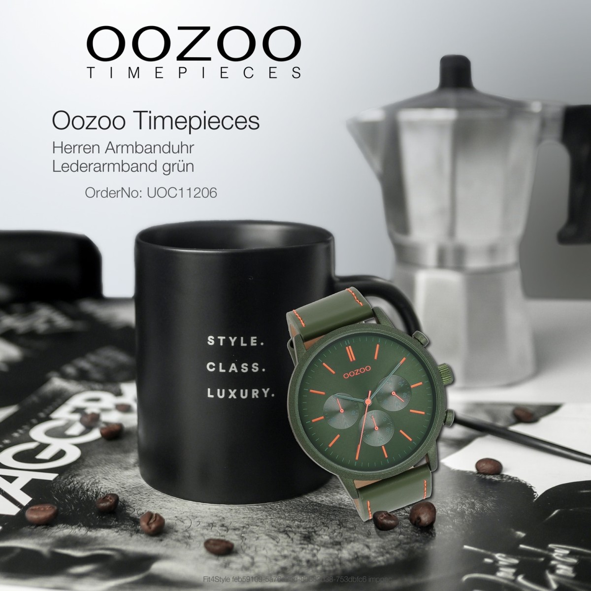 Diese Fashion Uhr für Herren aus der exklusiven Oozoo Oozoo Timepieces-Kollektion verfügt über ein hochwertiges Leder -Armband in grün . Das Gehäuse der Uhr ist extra groß (ca. 50mm). Das analoge Uhrwerk und das Uhrenglas aus Mineralglas machen diese Armbanduhr zu einem hochwertigen und modischen Begleiter.- besondere Eigenschaften