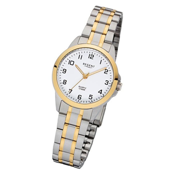 Eine Damenuhr RF1006 aus dem Hause Regent mit gold/silbernem Uhrenarmband aus tadellosem Edelstahl. Das resistente Mineralglas bewahrt die Uhr vor äußeren Einwirkungen.- Zusatzinformation