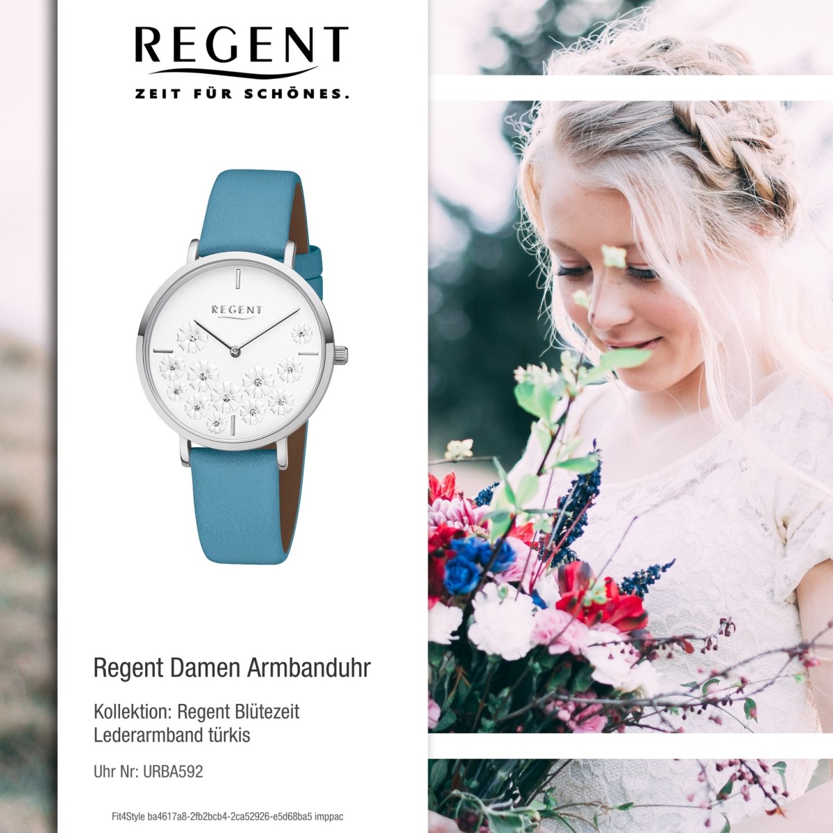 Diese Fashion Uhr für Damen aus der exklusiven Regent Blütezeit-Kollektion verfügt über ein hochwertiges Leder-Armband in türkis. Das analoge Quarzwerk und die Wasserdichte bis 3 bar machen diese Armbanduhr zu einem besonders zuverlässigen Begleiter.- besondere Eigenschaften