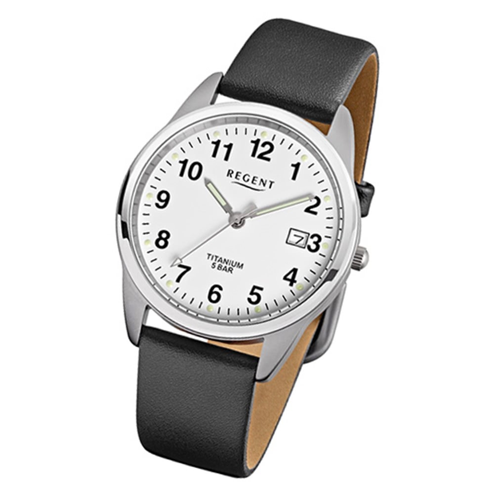 - Kurzbeschreibung: Regent Herren Titan Armbanduhr Quarzwerk Lederarmband schwarz URF685