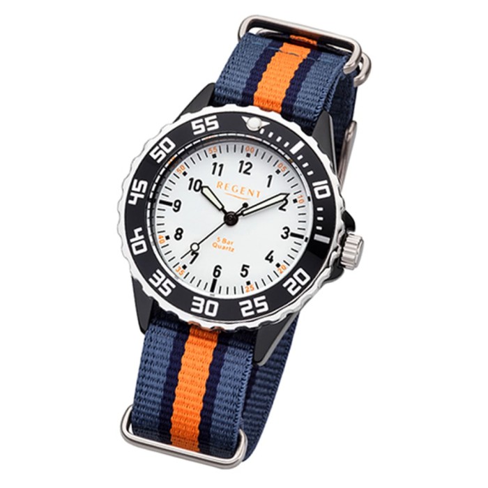 Diese Sport Uhr für Kinder aus der exklusiven Regent Kinderuhren-Kollektion verfügt über ein hochwertiges Textil-Armband in blau und orange. Das analoge Quarzwerk und die Wasserdichte bis 5 bar machen diese Armbanduhr zu einem besonders zuverlässigen Begleiter.Kinderfreundliche Motive, bequemer Tragekomfort und vor allem farbenfroh - das sind die Kinderuhren von Regent. Dank der übersichtlichen Ziffernblätter und der gut lesbaren Indexe wird das Ablesen der Uhrzeit für Mädchen und Jungen zum Kinderspiel.