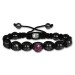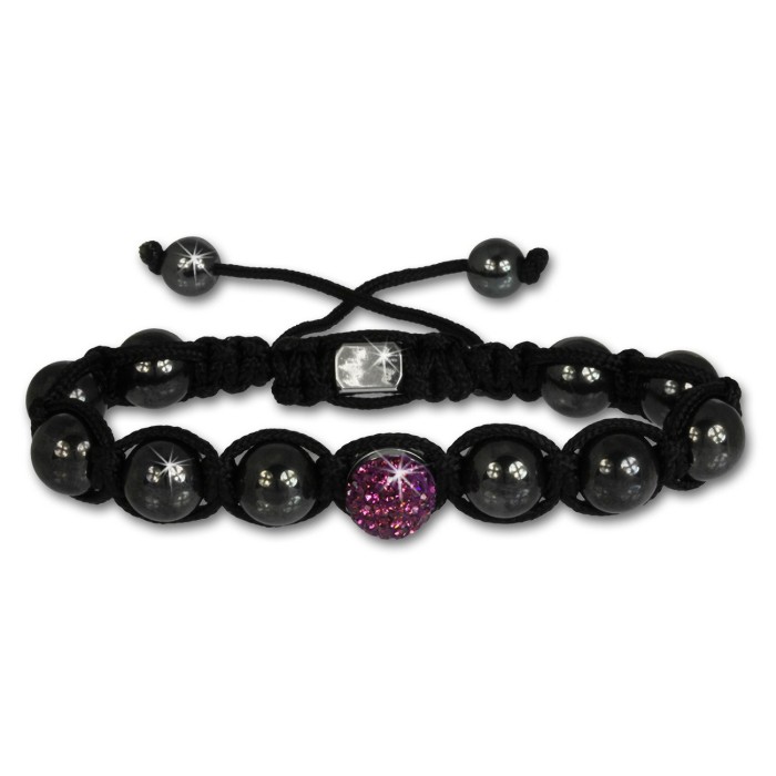 Shamballa Armband SterlinX London schwarz inklusive 1 lila Glitzerkugel. Die festen Kugeln sind aus schwarzem Hämatit, die Kugelfassungen und der Verschluss aus Edelstahl und die Glitzerkugel ist mit funkelnden lila farbenen Preciosa Zirkonia besetzt.