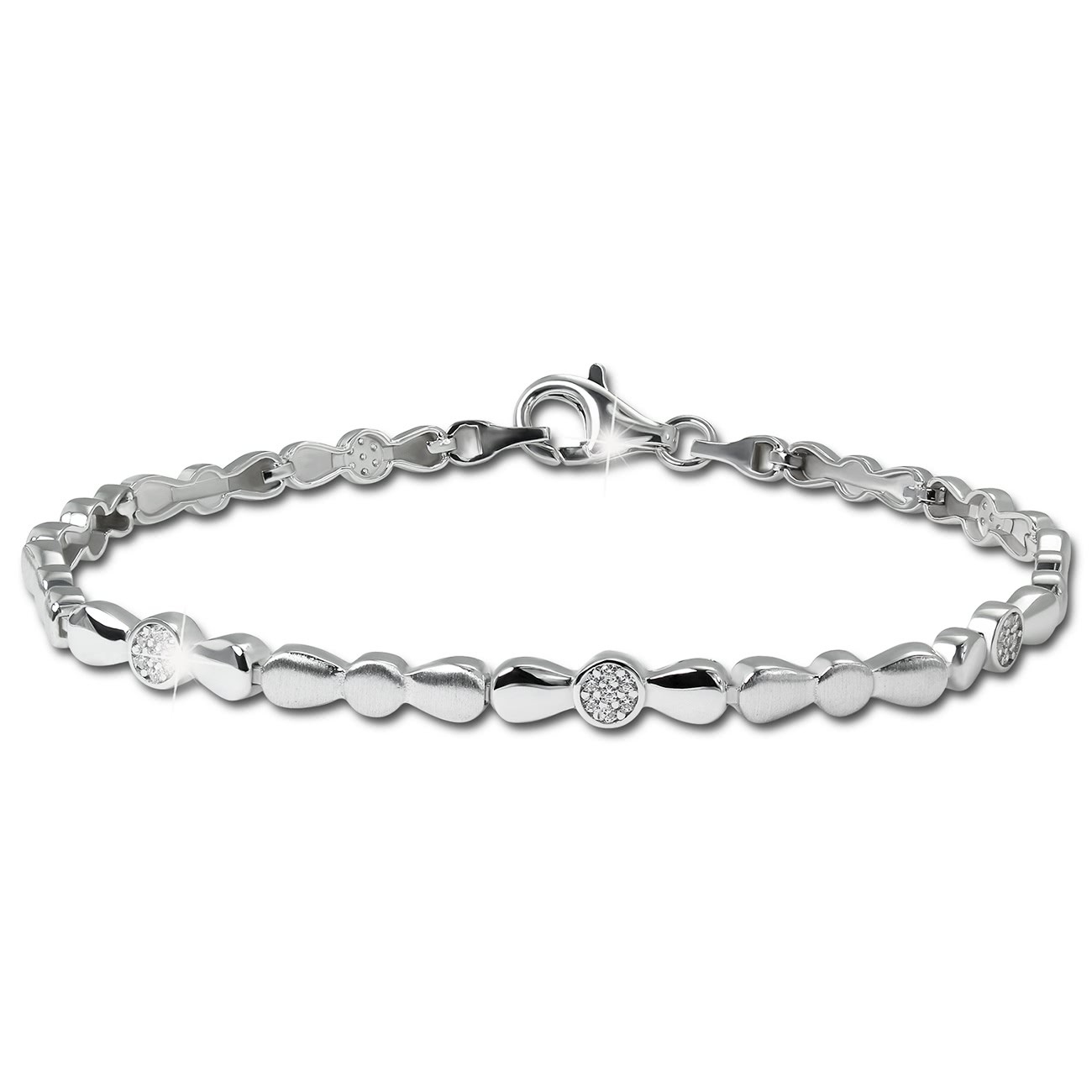 Ein zartes Armband Design Zirkonia weiß 19cm mit Karabinerverschluss. Das Armband ist aus unserer einzigartigen SilberDream Schmuck Kollektion und aus anlaufgeschütztem 925 Sterling Silber. Auf jedem Glied wechselt sich ein mattiertes Element mit einem glänzenden Element ab und dieses ist mit funkelnden Zirkonia besetzt. Dieses Silberarmband ist auch im Set (mit Collier Kette) erhältlich.