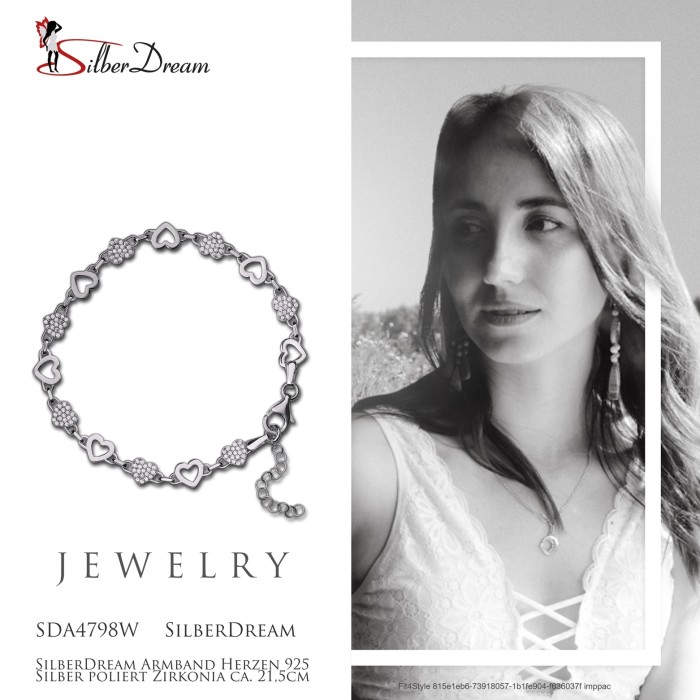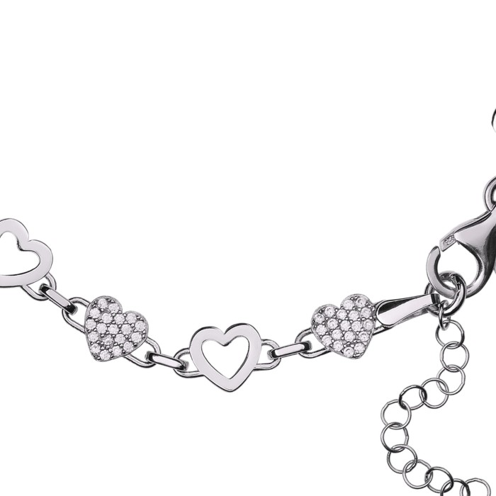 Ein edles Armband aus Gliedern in Herzform mit ca. 19cm - 21,5cm Länge mit Karabinerverschluss. Die Herzen sind abwechselnd offen und voll mit Zirkonia besetzt. Es ist aus der einzigartigen SilberDream Schmuck Kollektion und aus allergenfreiem, anlaufgeschütztem und poliertem 925 Sterling Silber.