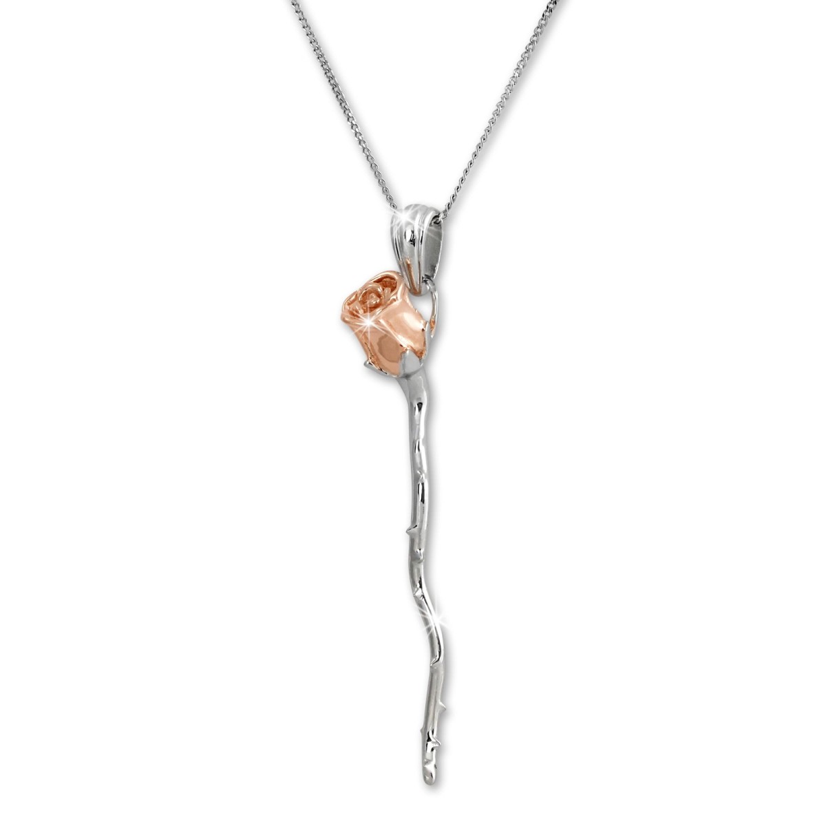 Eine feine Kette in 44cm plus 3cm Verlängerungskette aus anlaufgeschütztem 925 Sterling Silber, die Blüte der Stielrose ist rosévergoldet. Die Silberkette ist aus unserer SilberDream Schmuck-Kollektion und ist mit einem Karabinerverschluss versehen.