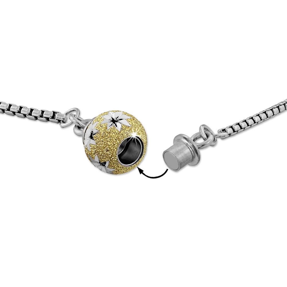 Eine moderne gedrehte silberne Collier Kette 45cm mit einer Magnetkugel im schwarzem Stern Design. Diese Halskette hat keinen separaten Verschluss, da in der Kugel ein Magnetverschluss integriert ist. Man zieht einfach leicht links und rechts an der Kugel und die Kette ist geöffnet. Diese Hals-Kette ist aus unserer SilberDream Schmuck Kollektion und aus anlaufgeschütztem 925 Sterling Silber. Die Kugel ist teilweise mit Schwarzrhodium überzogen und diamantiert.