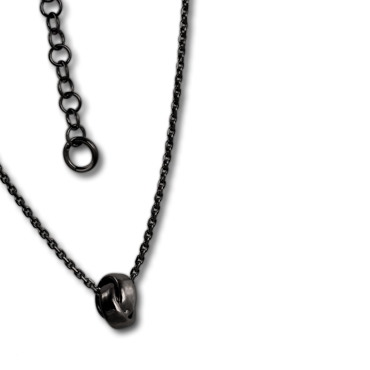 Eine moderne geschwärzte Kette mit verschlungenem Anhänger in 44cm plus 3cm Verlängerungskette aus anlaufgeschütztem 925 Sterling Silber und Schwarzrhodium beschichtet. Die Kette ist aus unserer SilberDream Schmuck Kollektion und mit einem Karabinerverschluss versehen. Das passende Armband finden Sie unter SDA1138S