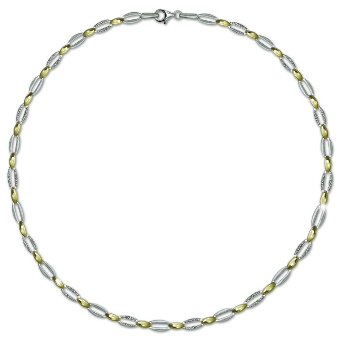 Eine moderne Collier Halskette Oval in der Länge 45cm mit einem Karabinerverschluss. Es wechselt sich ein mattiertes Element mit einem vergoldetem Element und einem Zirkonia besetztem Element ab. Das Collier ist aus der einzigartigen SilberDream Schmuck Kollektion und aus allergenfreiem 925 Sterling Silber. Diese Halskette ist auch im Set (mit Armband) erhältlich.