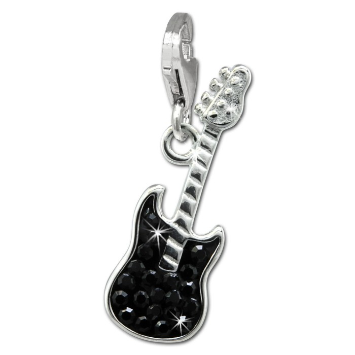 - E-Gitarre - ein Glitzer Charm mit tschechischen Kristallen und aus 925 Sterling Silber für Bettelarmband oder Halskette. Der funkelnde Anhänger passt auch an Armbänder anderer Hersteller oder kann als Kettenanhänger oder Anhänger für ein Handy genutzt werden. Die Zirkonia Kristalle erstrahlen auf dem Charm in der Farbe schwarz.