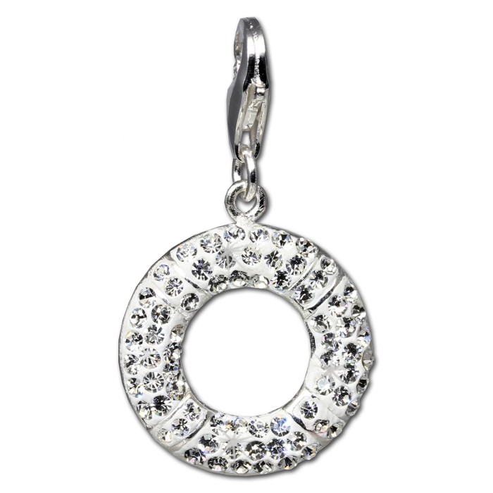 Ein Charm mit Zirkonias Kristallen - Ring mit Zirkonias Kristallen shiny weiß - aus 925 Sterling Silber für Bettelarmband oder Halskette. Der Charms Anhänger passt auch an Armbänder anderer Hersteller oder kann als Kettenanhänger oder Anhänger für ein Handy genutzt werden. Die Zirkonias erstrahlen auf dem Charm im klarem rot und weiß.