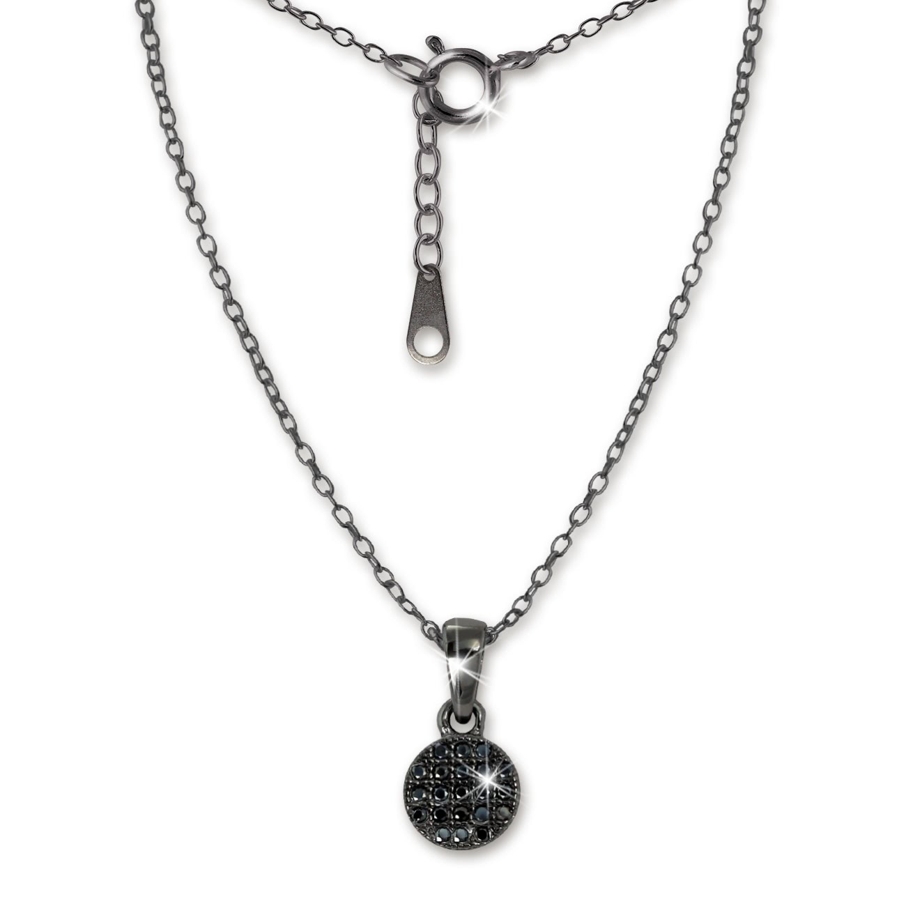 Eine zarte, geschwärzte Halskette Circle Zirkonia schwarz in der Gesamt-Länge von 45cm mit einem Federringverschluss. Den Verschluss kann man bei der Länge 42cm bis 45cm einhängen. Die Kette ist aus der einzigartigen SilberDream Schmuck Kollektion und aus allergenfreiem, anlaufgeschütztem und poliertem 925 Sterling Silber. Diese Halskette ist sehr fein und edel verarbeitet. Der Anhänger besteht aus vielen kleinen, funkelnden, schwarzen Zirkonias.