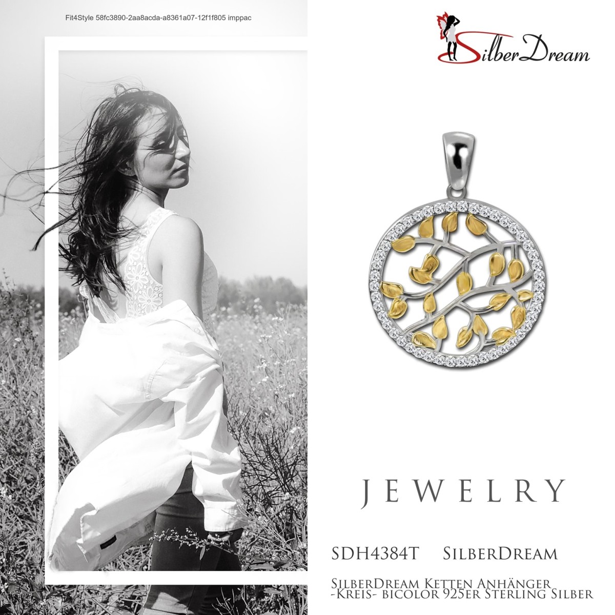 Ein Kettenanhänger - Kreis - aus 925er Sterling Silber gefertigt. Im Inneren des Kreises sind filigrane Äste und Blätter angebracht. Die Blätter sind vergoldet und der Kreis ist rundherum mit funkelnden Zirkonia besetzt. Der Anhänger ist aus unserer einzigartigen SilberDream Kollektion und aus anlaufgeschütztem, glänzendem 925er Sterling Silber. Wir haben die passenden Ohrringe im Programm, schauen sie einfach unter SDO4.... nach!