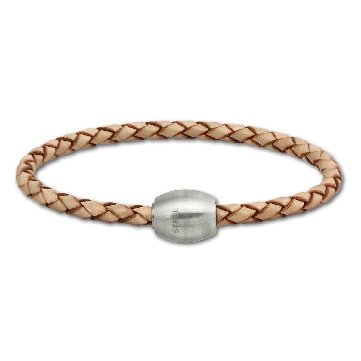 Ein geflochtenes Leder Armband in der Farbe natur mit Stainless Steel Magnet Verschluss. Die Breite des Leder Bandes ist 4mm und die Länge ist 21cm.