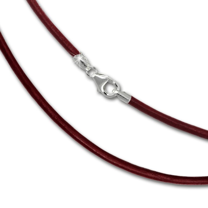 Eine Leder Kette 2mm stark in der Farbe rot mit Karabiner Verschluss, Sterling Silber 925er. Die Länge des Bandes ist 45cm.
