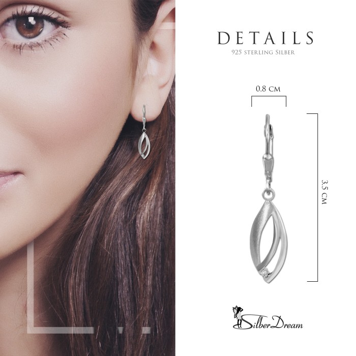 Ein Paar Ohrhänger -Blatt- mit einem weißen Zirkonia, schicke Ohrringe aus unserer einzigartigen SilberDream Schmuck Kollektion aus allergenfreiem 925 Sterling Silber. Das Highlight der Ohrringe ist eine teils mattierte und teils polierte Oberfläche. Die Länge der Ohrhänger beträgt ca. 3,5cm. Der weiße Zirkonia funkelt und leuchtet auf den Ohrringen.