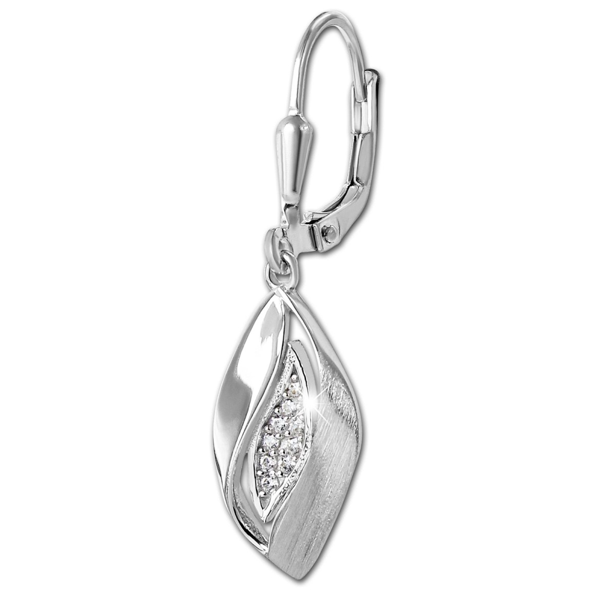 Ein Paar Ohrhänger Leaf Zirkonia weiß aus unserer SilberDream Schmuck Kollektion. Die Ohrringe sind zur Hälfte mattiert und in der Mitte mit kleinen funkelnden Zirkonias besetzt. Diese Ohrringe sind aus anlaufgeschütztem 925 Sterling Silber.