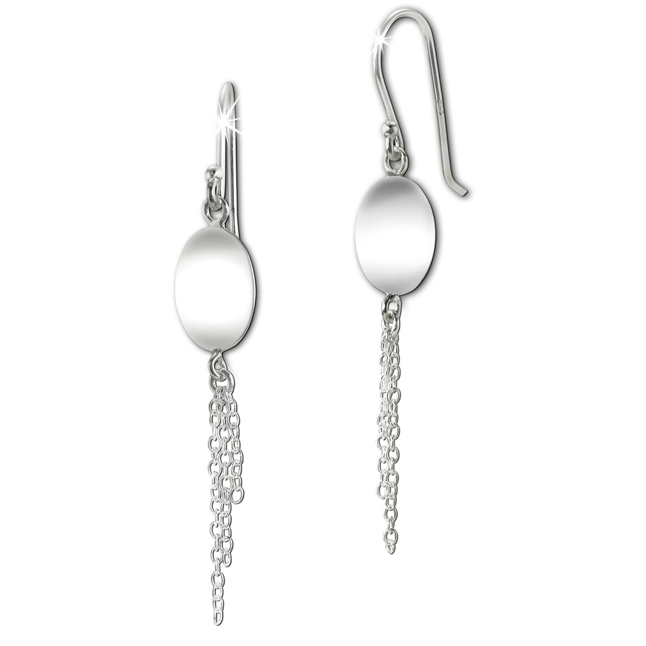 Die glänzenden Ohrhänger Oval sind aus poliertem 925 Sterling Silber und schwingen am Ohr hin und her. Die Ohrringe haben unten 3 unterschiedlich lange Kettchen hängen und sind aus der SilberDream Silberschmuck Schmuck Kollektion.