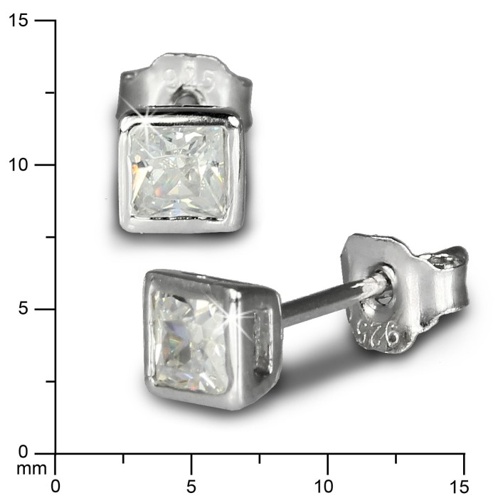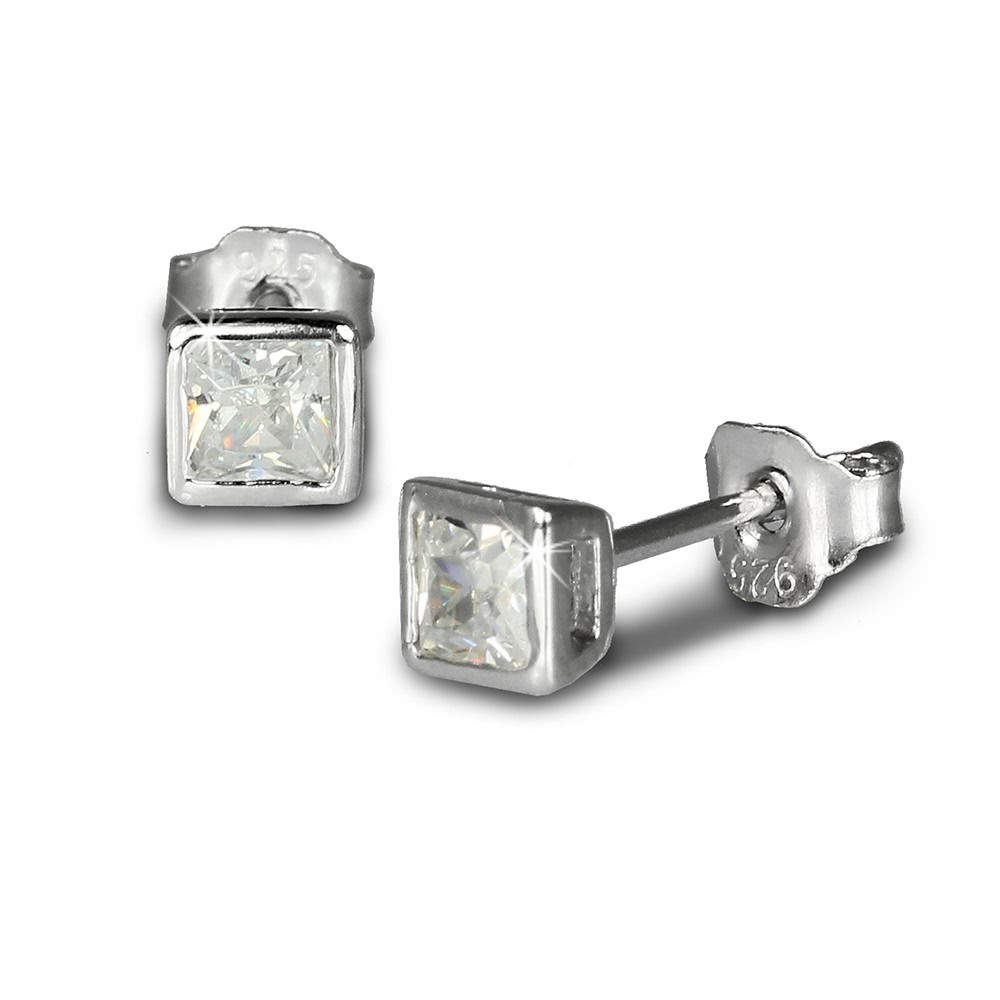 Ein Paar Ohrstecker Zirkonia weiß 4mm Quadrat, Glitzer-Ohrringe aus unserer einzigartigen SilberDream Schmuck Kollektion aus anlaufgeschütztem 925er Sterling Silber.