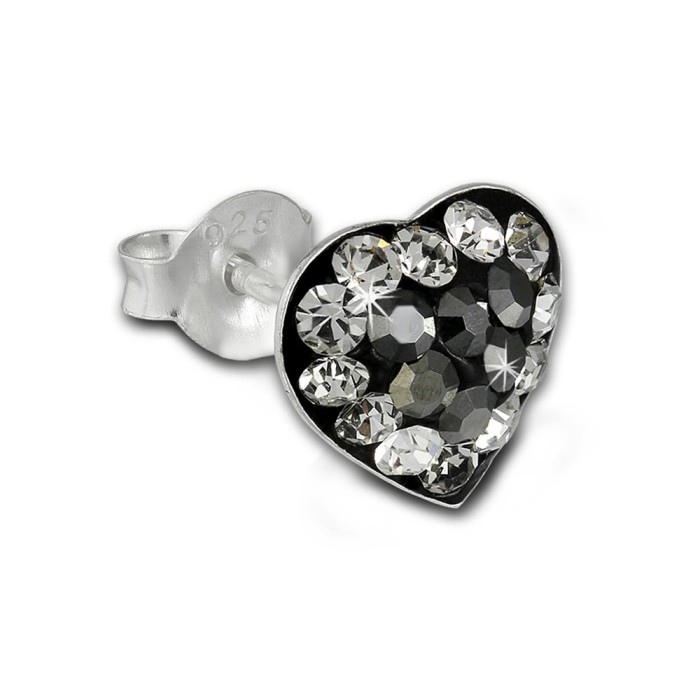 Ein Paar Ohrstecker Herz mit kleinen weißen und grauen Zirkonias, massive Silber Ohrringe aus unserer einzigartigen SilberDream Kollektion aus anlaufgeschütztem 925 Sterling Silber. Die Kristalle funkeln und glitzern auf dem Ohrring.