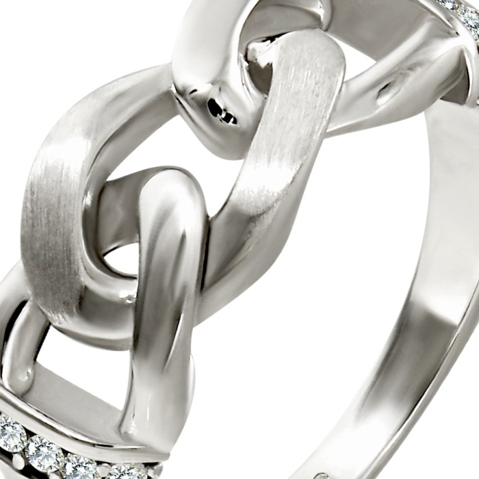 Ein moderner Silberring Chain im trendigem Design mit weißen, funkelnden Zirkonias besetzt. Der Ring ist an der Vorderseite teilweise mattiert. Der Ring ist aus unserer einzigartigen SilberDream Kollektion aus anlaufgeschütztem 925 Sterling Silber. Der Ring hat eine Größe von 58 und damit einen Innendurchmesser von ca. 18,5mm. Den Ring gibt es auch in den Größen 56, 60 und 62.