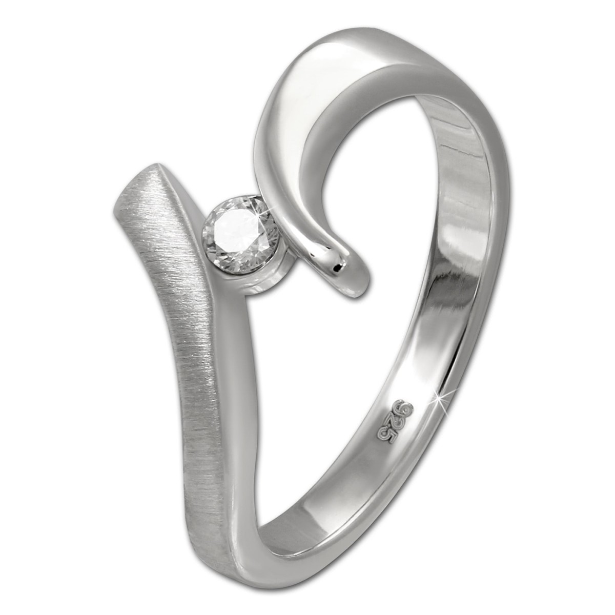 Ein schlichter Silberring Klassik im trendigem Design mit einem weißen, funkelnden Zirkonia. Die eine Seite des Ringes ist an der Vorderseite mattiert. Der Ring ist aus unserer einzigartigen SilberDream Kollektion aus anlaufgeschütztem 925 Sterling Silber. Der Ring hat eine Größe von 58 und damit einen Innendurchmesser von ca. 18,5mm. Den Ring gibt es auch in den Größen 56, 60 und 62.