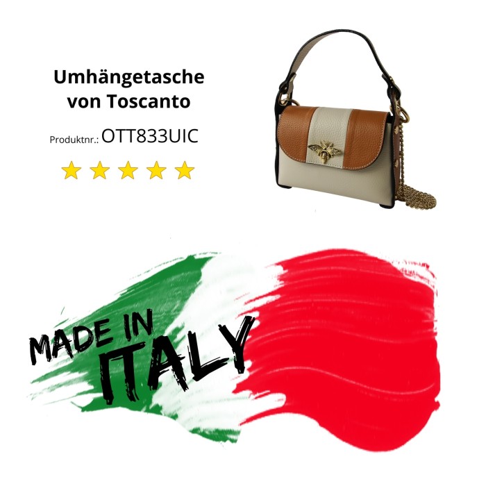 Diese trendige Damen Tasche von Toscanto aus der Toscanto Handbags Kollektion ist ein cooles Accessoire und ein echter Hingucker. Die beige, braune Tasche ist der ideale Begleiter für den eleganten Abend.Toscanto steht für hochwertige Lederarbeit und modisch designte Echtlederartikel aus Italien. Das verarbeiteten Leder unterliegt italienischen Qualitäts- und Herstellungsrichtlinien.
