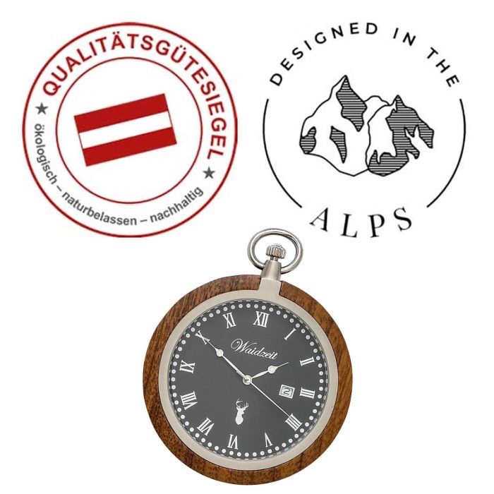Die Waidzeit Taschenuhren sind hochwertige Zeitmesser mit schweizer Uhrwerk, gefertigt aus heimischem Holz wie Eiche, Walnuss oder Zirbe angeboten in einer hochwertigen Holzschatulle.